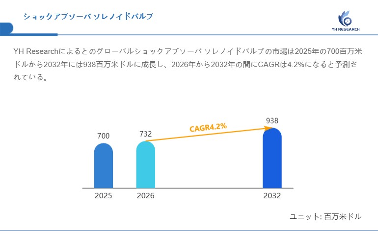 YH Researchによるとのグローバルショックアブソーバ ソレノイドバルブの市場は2025年の700百万米ドルから2032年には938百万米ドルに成長し、2026年から2032年の間にCAGRは4.2%になると予測されている。