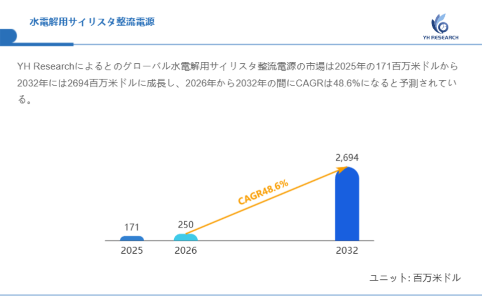 YH Researchによるとのグローバル水電解用サイリスタ整流電源の市場は2025年の171百万米ドルから2032年には2694百万米ドルに成長し、2026年から2032年の間にCAGRは48.6%になると予測されている。