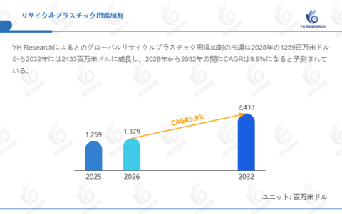 YH Researchによるとのグローバルリサイクルプラスチック用添加剤の市場は2025年の1259百万米ドルから2032年には2433百万米ドルに成長し、2026年から2032年の間にCAGRは9.9%になると予測されている。