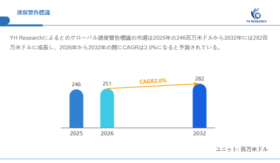 YH Researchによるとのグローバル速度警告標識の市場は2025年の246百万米ドルから2032年には282百万米ドルに成長し、2026年から2032年の間にCAGRは2.0%になると予測されている。