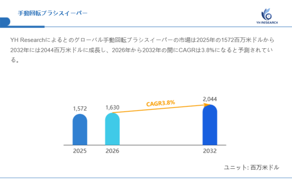 YH Researchによるとのグローバル手動回転ブラシスイーパーの市場は2025年の1572百万米ドルから2032年には2044百万米ドルに成長し、2026年から2032年の間にCAGRは3.8%になると予測されている。