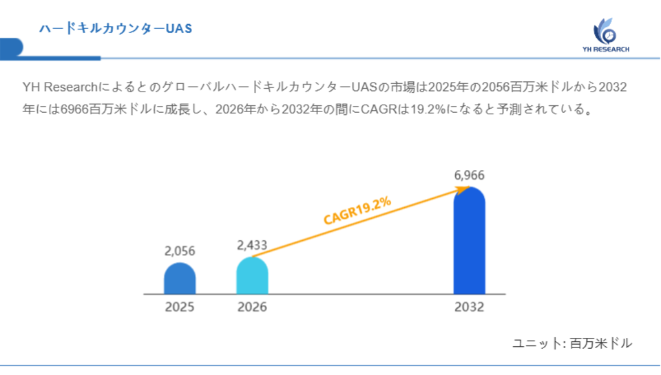 YH ResearchによるとのグローバルハードキルカウンターUASの市場は2025年の2056百万米ドルから2032年には6966百万米ドルに成長し、2026年から2032年の間にCAGRは19.2%になると予測されている。