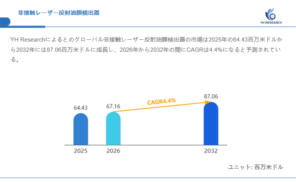 YH Researchによるとのグローバル非接触レーザー反射油膜検出器の市場は2025年の64.43百万米ドルから2032年には87.06百万米ドルに成長し、2026年から2032年の間にCAGRは4.4%になると予測されている。