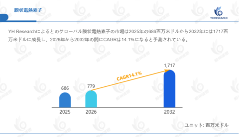 YH Researchによるとのグローバル膜状電熱素子の市場は2025年の686百万米ドルから2032年には1717百万米ドルに成長し、2026年から2032年の間にCAGRは14.1%になると予測されている。