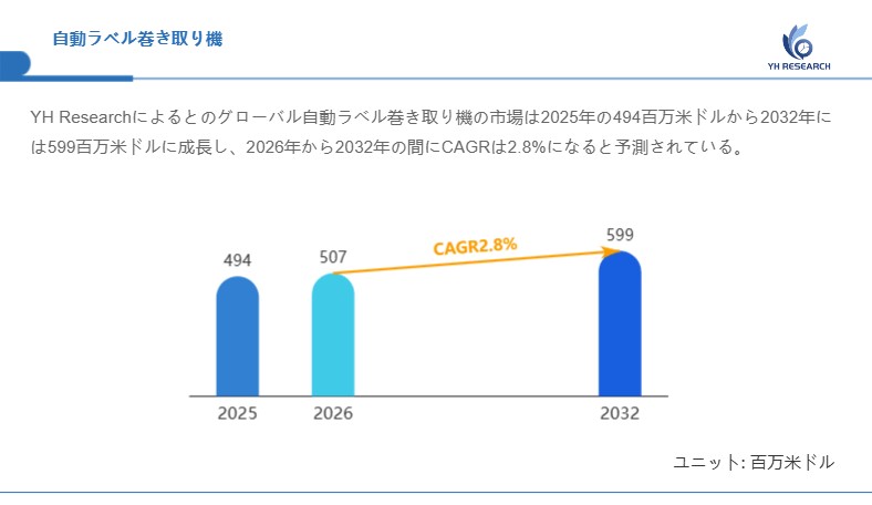 YH Researchによるとのグローバル自動ラベル巻き取り機の市場は2025年の494百万米ドルから2032年には599百万米ドルに成長し、2026年から2032年の間にCAGRは2.8%になると予測されている。