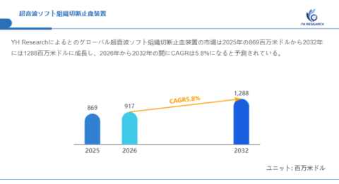 YH Researchによるとのグローバル超音波ソフト組織切断止血装置の市場は2025年の869百万米ドルから2032年には1288百万米ドルに成長し、2026年から2032年の間にCAGRは5.8%になると予測されている。