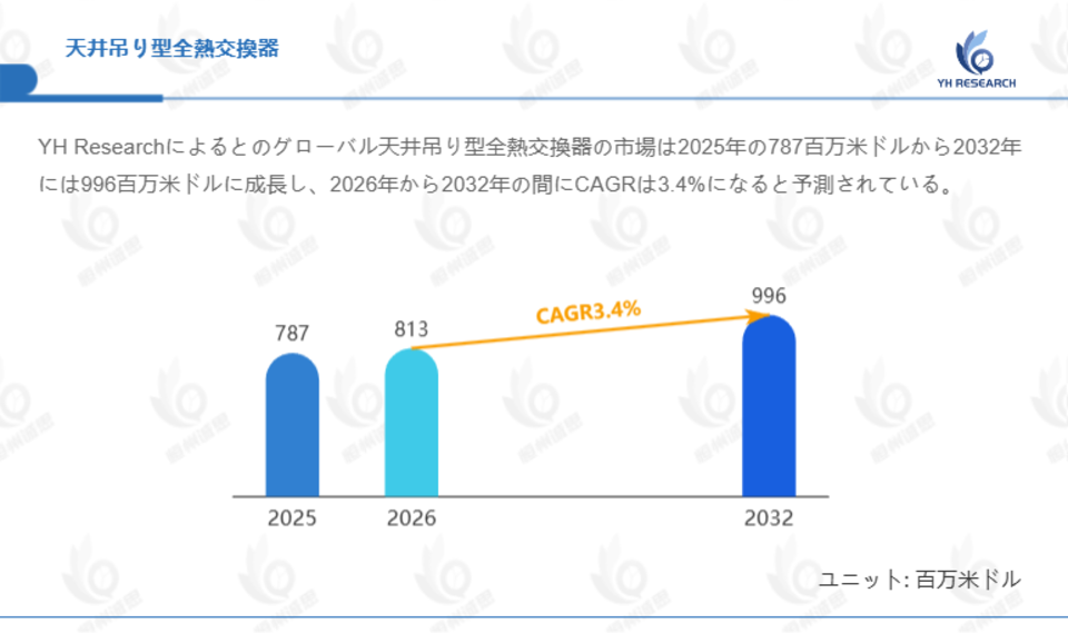 YH Researchによるとのグローバル天井吊り型全熱交換器の市場は2025年の787百万米ドルから2032年には996百万米ドルに成長し、2026年から2032年の間にCAGRは3.4%になると予測されている。
