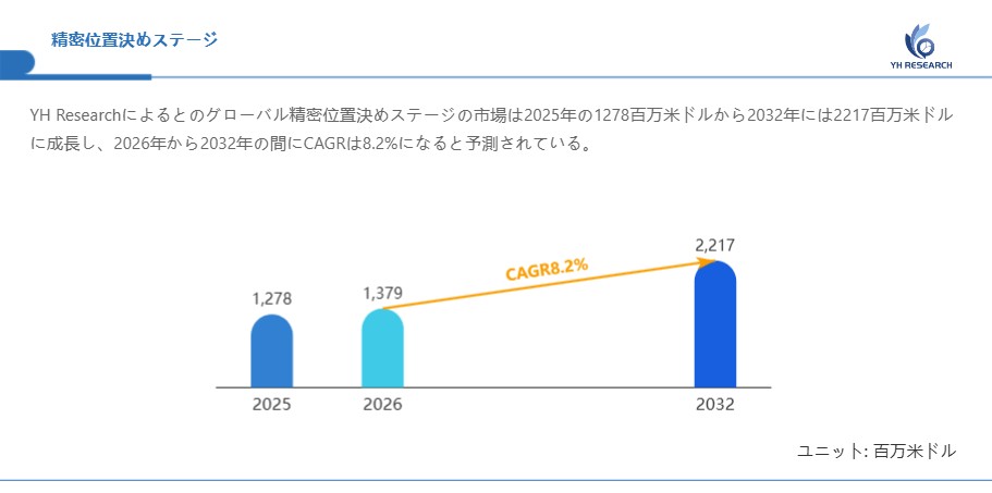 YH Researchの最新調査によると、世界の精密位置決めステージ市場規模は2025年に1278百万米ドルに達しました。市場の拡大は今後も継続すると見込まれており、2026年には1379百万米ドルへ成長する見通しです。さらに、中長期的には需要の拡大や関連産業の発展を背景に市場規模は着実に拡大し、2032年には2217百万米ドルに到達すると予測されています。これにより、2026年から2032年の期間における年平均成長率(CAGR)は8.2%となる見込みです。