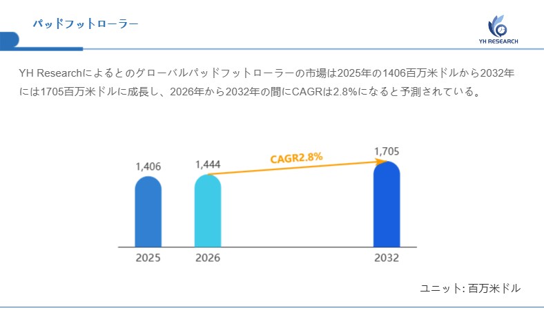YH Researchによるとのグローバルパッドフットローラーの市場は2025年の1406百万米ドルから2032年には1705百万米ドルに成長し、2026年から2032年の間にCAGRは2.8%になると予測されている。