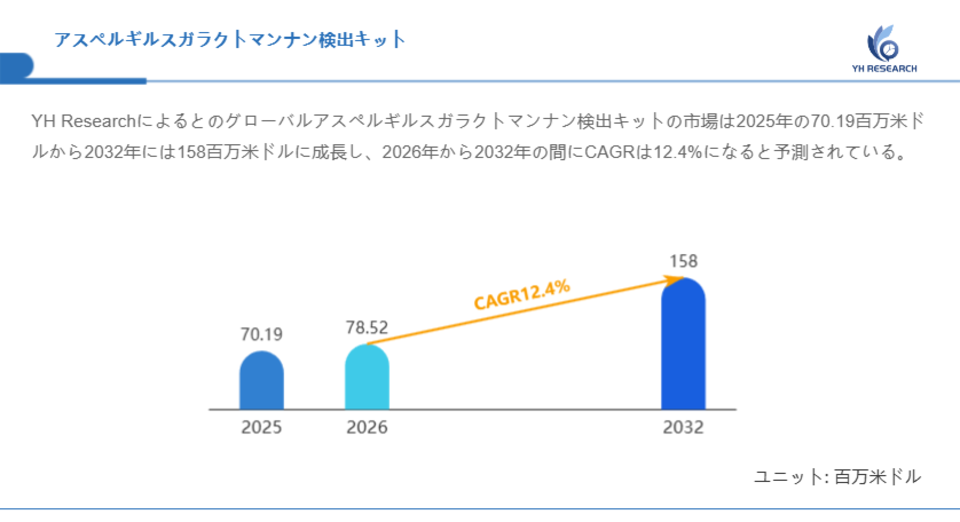 YH Researchによるとのグローバルアスペルギルスガラクトマンナン検出キットの市場は2025年の70.19百万米ドルから2032年には158百万米ドルに成長し、2026年から2032年の間にCAGRは12.4%になると予測されている。