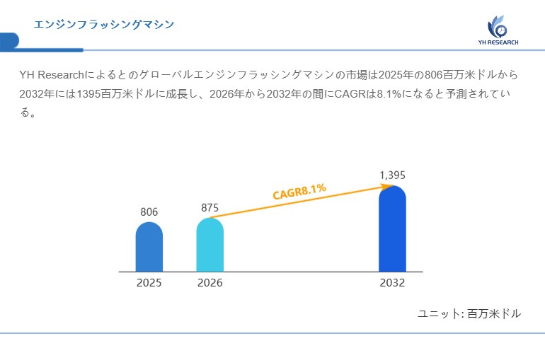 YH Researchによるとのグローバルエンジンフラッシングマシンの市場は2025年の806百万米ドルから2032年には1395百万米ドルに成長し、2026年から2032年の間にCAGRは8.1%になると予測されている。