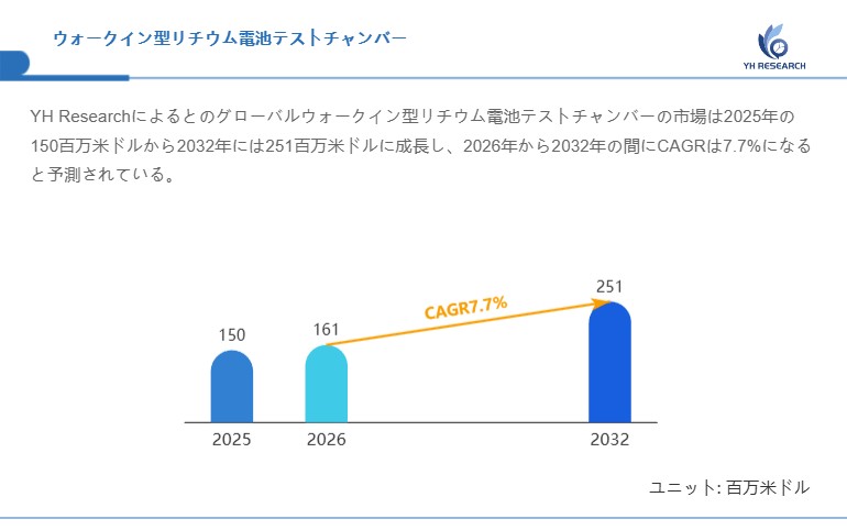 YH Researchによるとのグローバルウォークイン型リチウム電池テストチャンバーの市場は2025年の150百万米ドルから2032年には251百万米ドルに成長し、2026年から2032年の間にCAGRは7.7%になると予測されている。