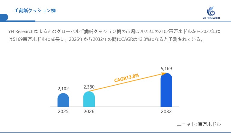 YH Researchによるとのグローバル手動紙クッション機の市場は2025年の2102百万米ドルから2032年には5169百万米ドルに成長し、2026年から2032年の間にCAGRは13.8%になると予測されている。