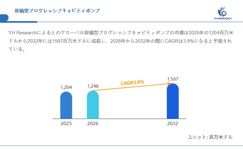 YH Researchによるとのグローバル容積型プログレッシブキャビティポンプの市場は2025年の1204百万米ドルから2032年には1567百万米ドルに成長し、2026年から2032年の間にCAGRは3.9%になると予測されている。