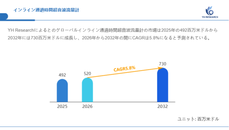 YH Researchによるとのグローバルインライン通過時間超音波流量計の市場は2025年の492百万米ドルから2032年には730百万米ドルに成長し、2026年から2032年の間にCAGRは5.8%になると予測されている。