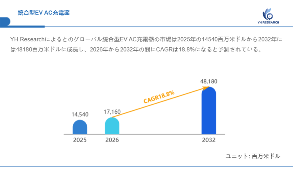 YH Researchによるとのグローバル統合型EV AC充電器の市場は2025年の14540百万米ドルから2032年には48180百万米ドルに成長し、2026年から2032年の間にCAGRは18.8%になると予測されている。