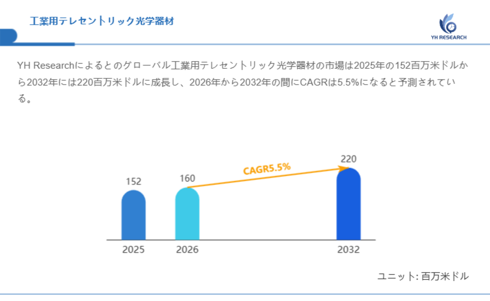 YH Researchによるとのグローバル工業用テレセントリック光学器材の市場は2025年の152百万米ドルから2032年には220百万米ドルに成長し、2026年から2032年の間にCAGRは5.5%になると予測されている。