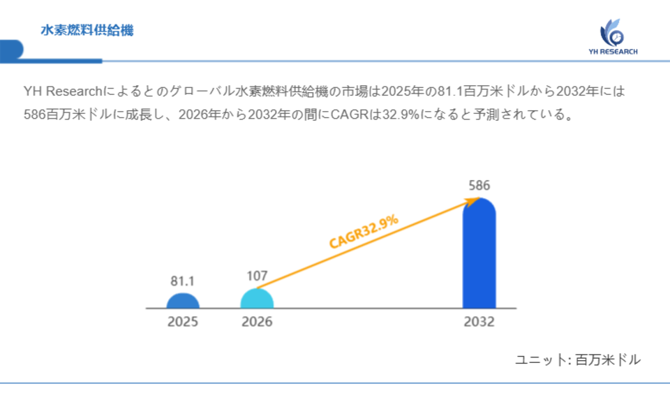 YH Researchによるとのグローバル水素燃料供給機の市場は2025年の81.1百万米ドルから2032年には586百万米ドルに成長し、2026年から2032年の間にCAGRは32.9%になると予測されている。