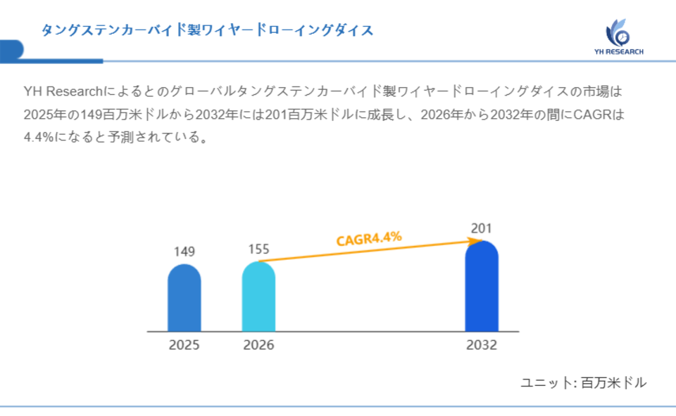 YH Researchによるとのグローバルタングステンカーバイド製ワイヤードローイングダイスの市場は2025年の149百万米ドルから2032年には201百万米ドルに成長し、2026年から2032年の間にCAGRは4.4%になると予測されている。