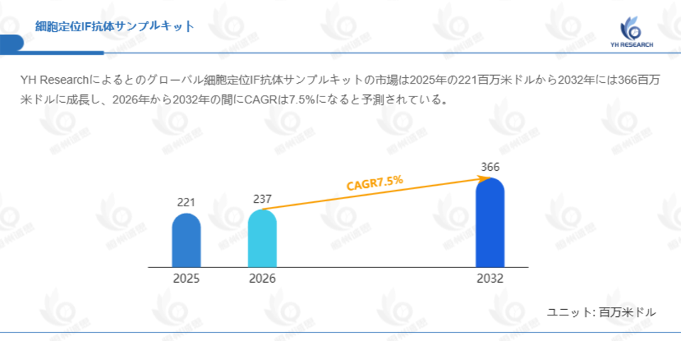 YH Researchによるとのグローバル細胞定位IF抗体サンプルキットの市場は2025年の221百万米ドルから2032年には366百万米ドルに成長し、2026年から2032年の間にCAGRは7.5%になると予測されている。
