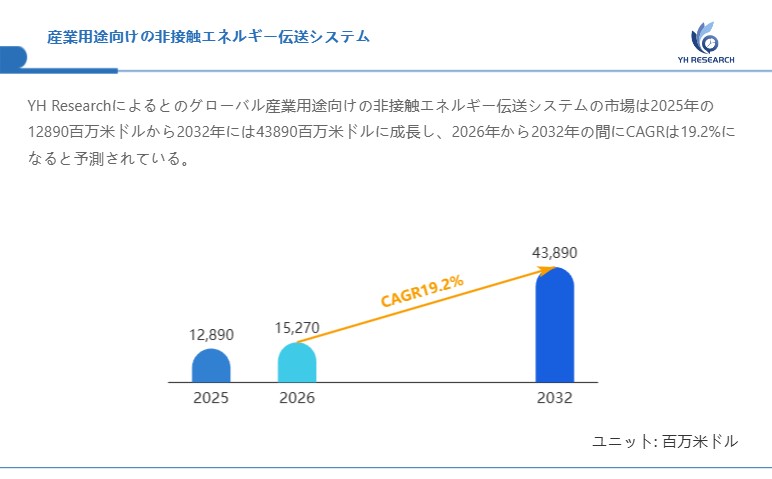 YH Researchによるとのグローバル産業用途向けの非接触エネルギー伝送システムの市場は2025年の12890百万米ドルから2032年には43890百万米ドルに成長し、2026年から2032年の間にCAGRは19.2%になると予測されている。